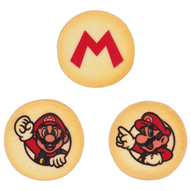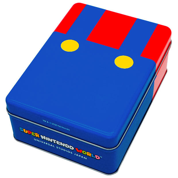 マリオがプリントされたクッキーが24枚入ってるよ。マリオのコスチューム柄のかわいい缶は、食べ終わったあとに小物入れとしても使えるね。